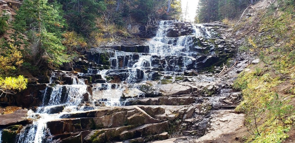 Gloria Falls is a BEAUTIFUL, easy & short hike up Little Cottonwood Canyon. If you are hiking to Red Pine Lake, it is an easy detour as well & well worth it. Last year we went both in the Early Spring & then in fall time & both were super pretty! Family friendly hike, at just over 2 miles. Wonderful views & a nice final destination. In early spring there was TONS of snow, sometimes I sunk hip deep into it 🙂 Fall was super pretty with all the colors!
