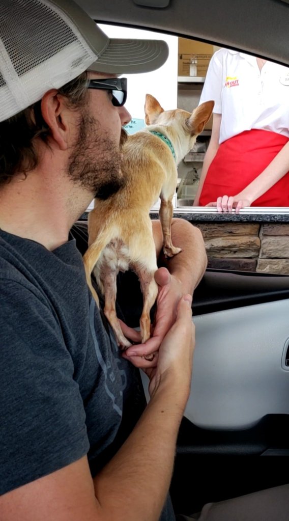 In N Out- pup patties- an unsalted little hamburger patty- our dogs go crazy for this one, and of course Chris has to get a double double & a shake while we are at it!!