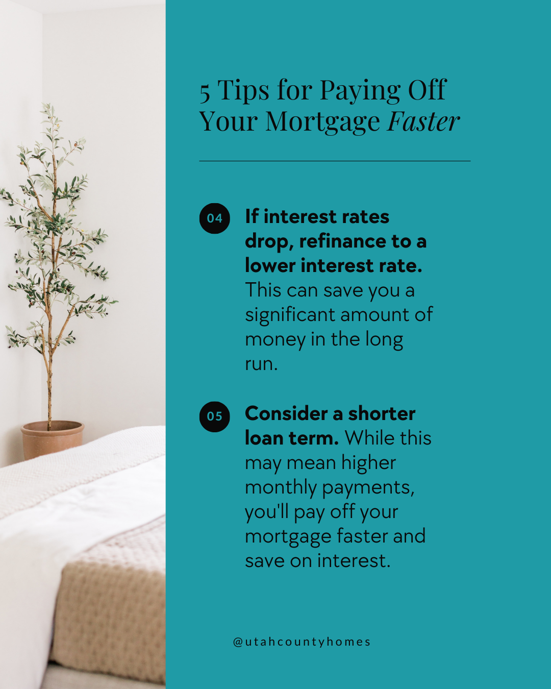 5) Consider a shorter loan term. While this may mean higher monthly payments, you’ll pay off your mortgage faster and save on interest.