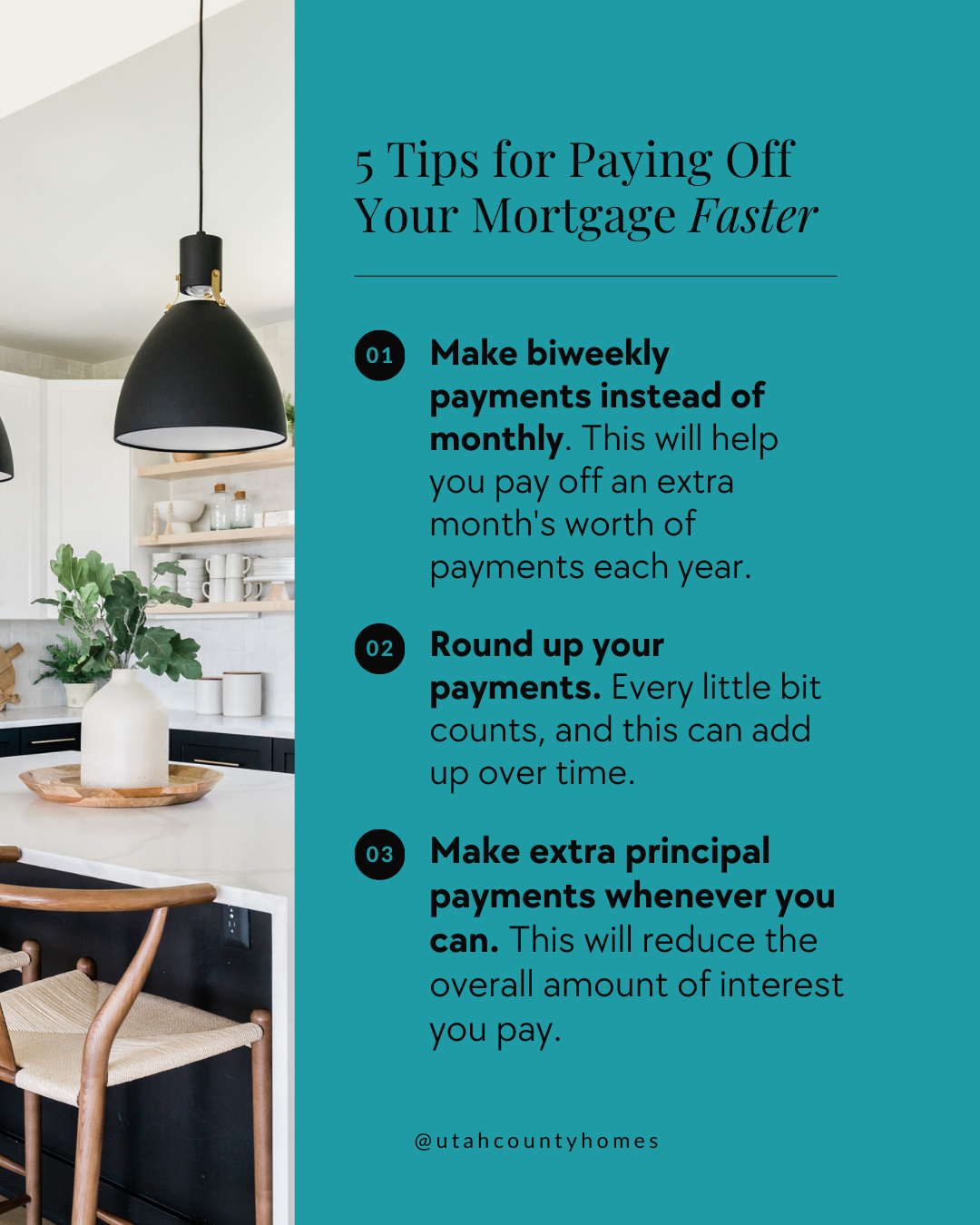 1) Make biweekly payments instead of monthly. This will help you pay off an extra month’s worth of payments each year.