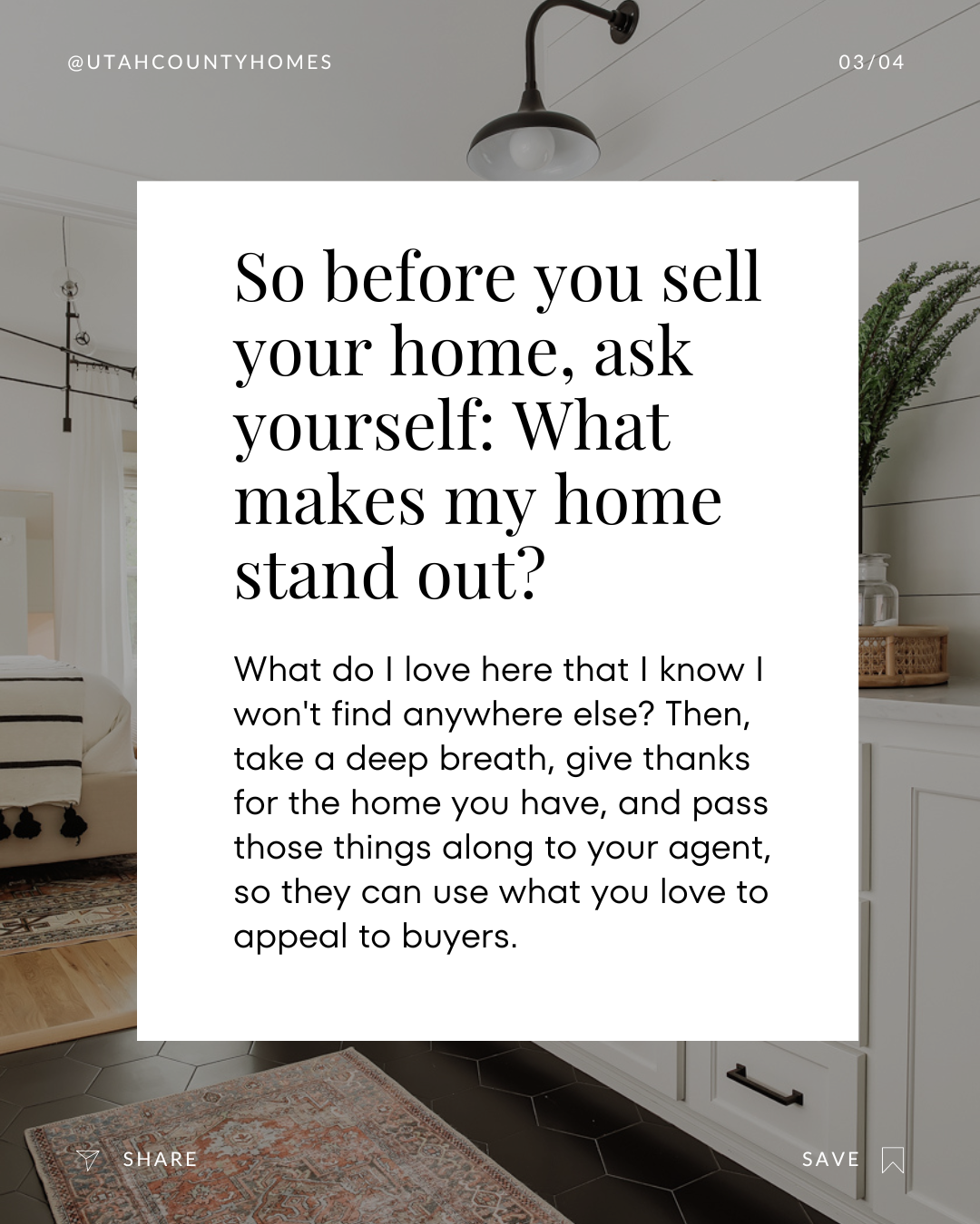 So before you sell your home, ask yourself: What makes my home stand out? What do I love here that I know I won’t find anywhere else? Then, take a deep breath, give thanks for the home you have, and pass those things along to your agent, so they can use what you love to appeal to buyers.