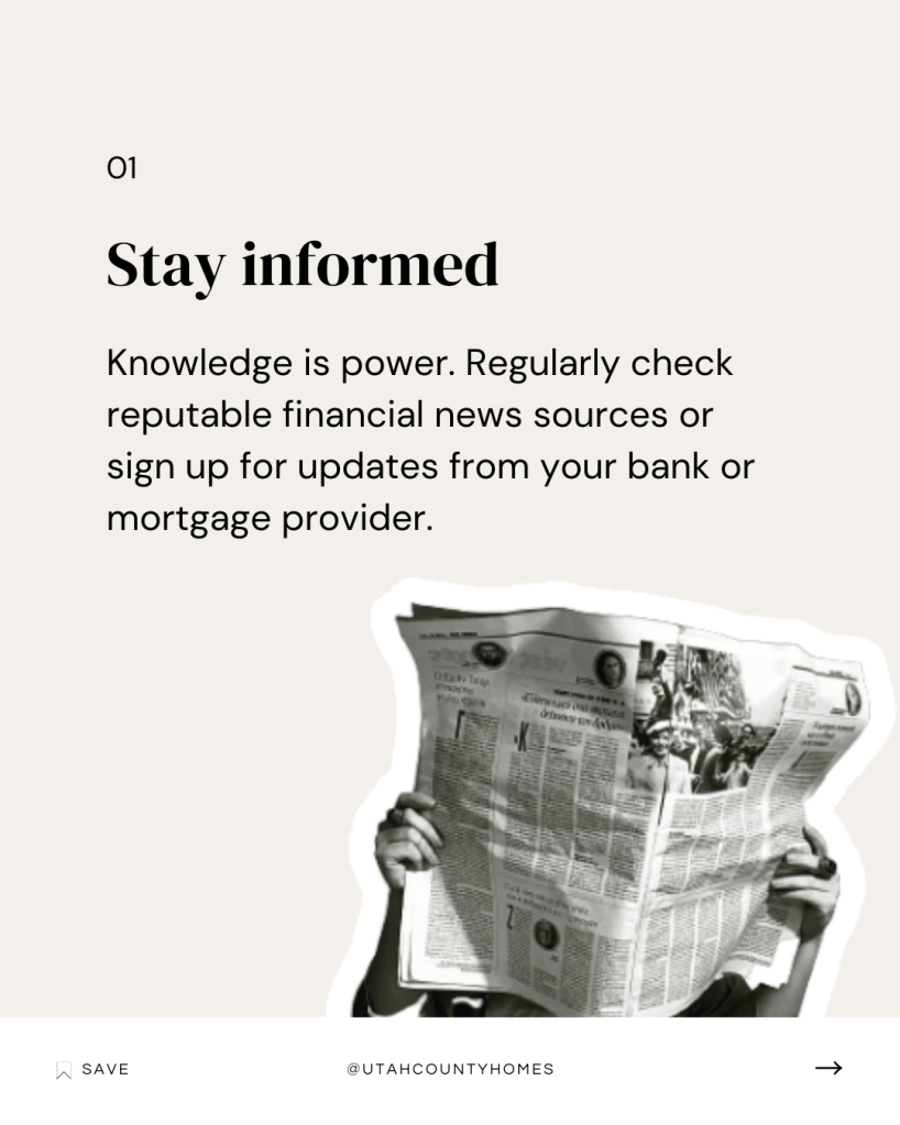 1) Stay informed: Knowledge is power. Regularly check reputable financial news sources or sign up for updates from your bank or mortgage provider.