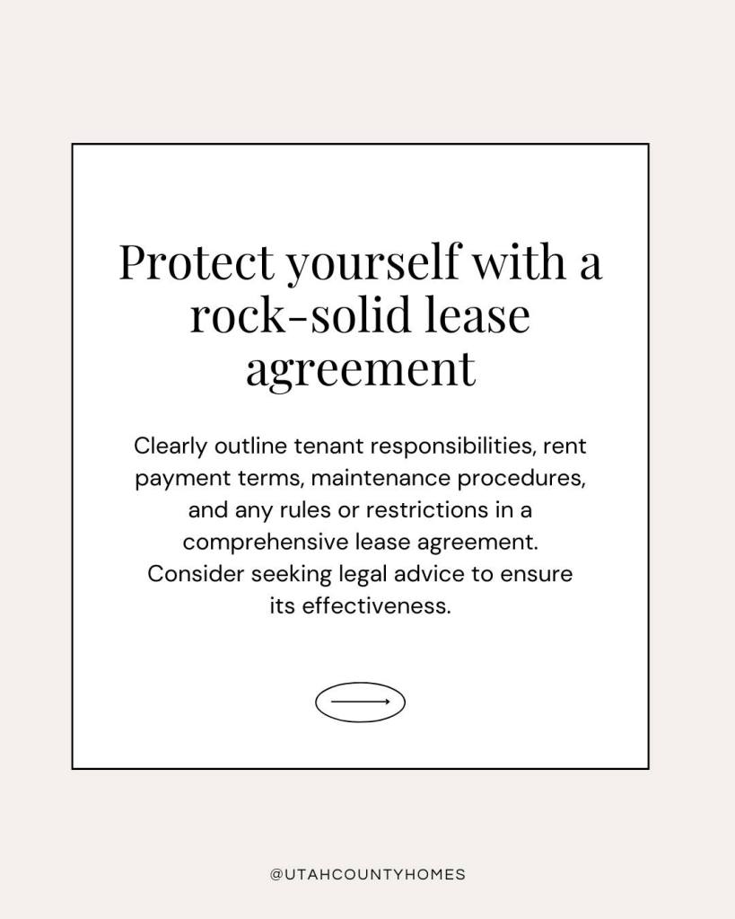 • Protect yourself with a rock-solid lease agreement. Clearly outline tenant responsibilities, rent payment terms, maintenance procedures, and any rules or restrictions in a comprehensive lease agreement. Consider seeking legal advice to ensure its effectiveness.