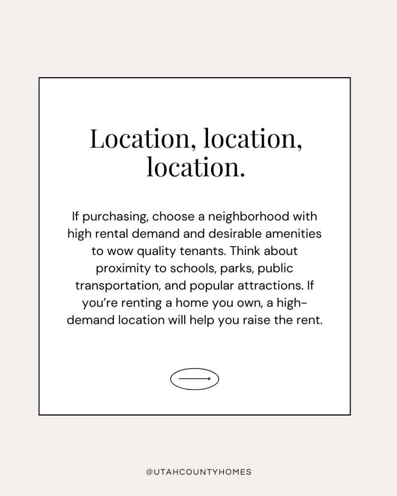 • Location, location, location. If purchasing, choose a neighborhood with high rental demand and desirable amenities to wow quality tenants. Think about proximity to schools, parks, public transportation, and popular attractions. If you’re renting a home you own, a high-demand location will help you raise the rent.